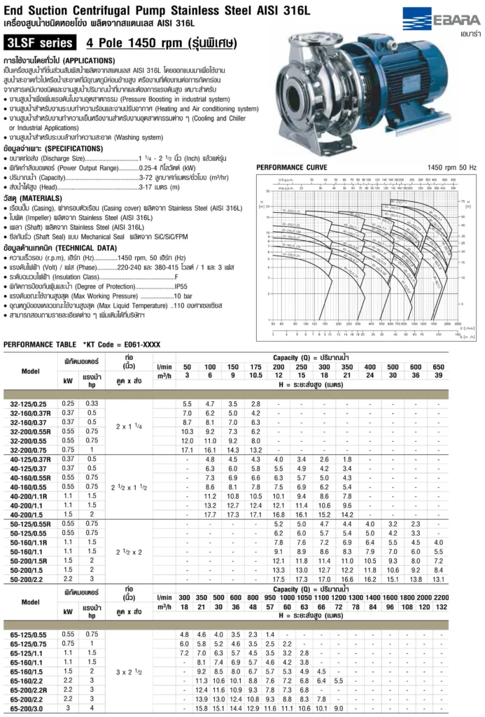 EBARA ปั๊มหอยโข่งSS 316/หัวปั๊ม รุ่น 3LSF-65-160/7.5