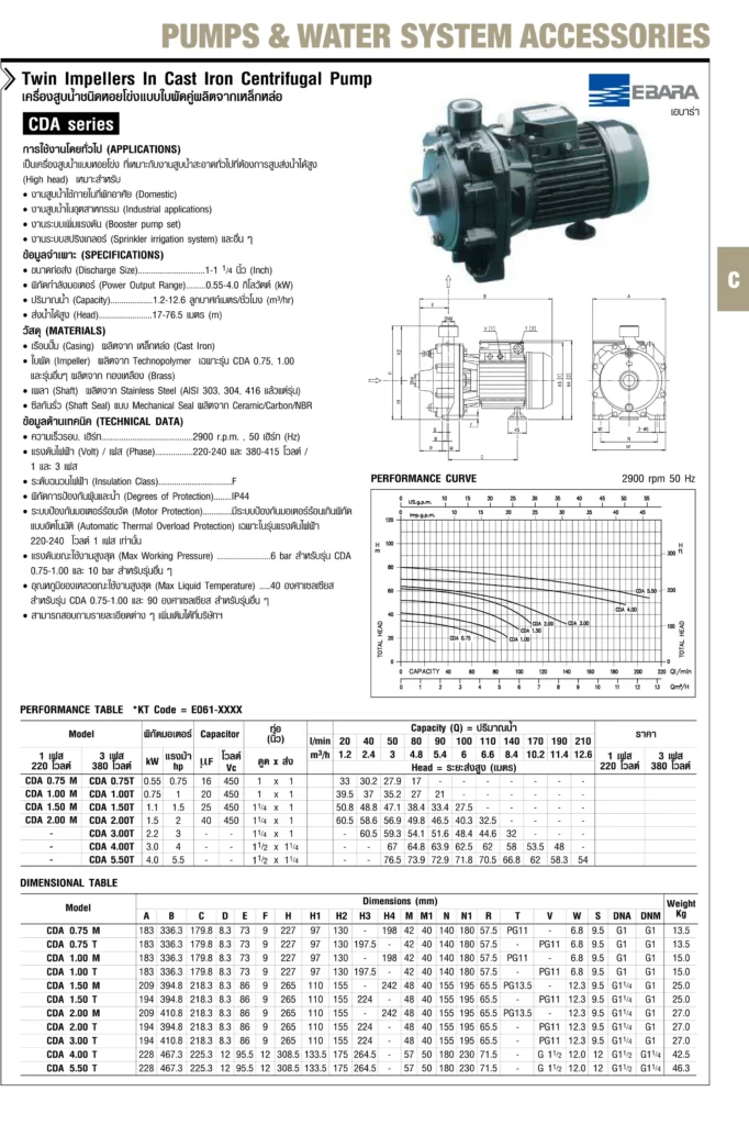 เหล็กหล่อ Ebara ปั๊มน้ำหลายใบพัด โรงงานอุตสาหกรรม CDAEBARA ปั๊มหอยโข่งใบพัดคู่เหล็กหล่อ(1.5HP 3สาย)รุ่น CDA-1.50T